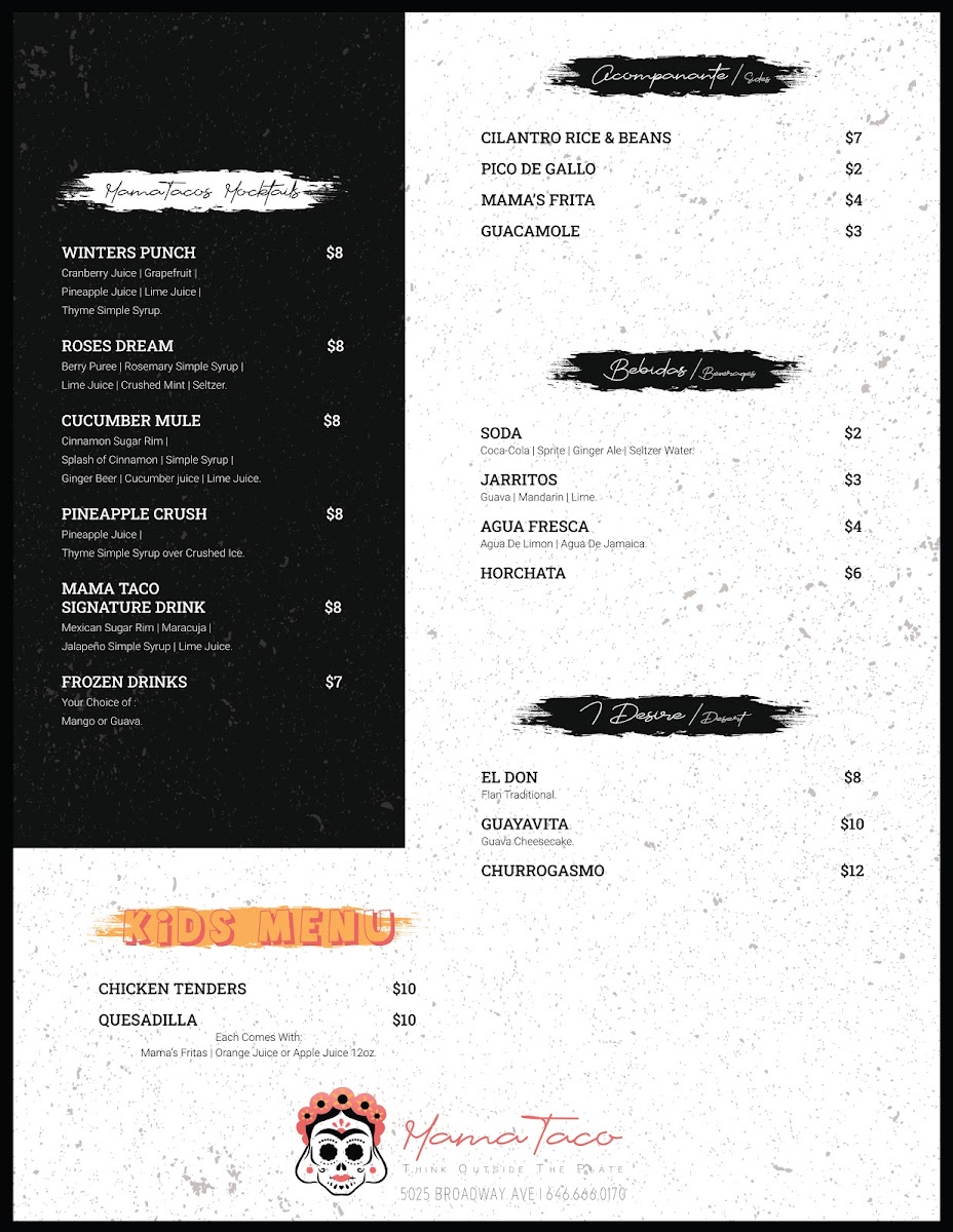 Welcome to MaMaTaco, a vibrant culinary gem located at 5025 Broadway, New York. Here, tacos are not just food; they’re a celebration of flavors. The menu features highlights like the Pa'Jalisco Birria-style tacos, with tender beef enveloped in a warm tortilla, paired with a savory consomme for dipping—truly a must-try at $18. The El Asado and Los Americanos tacos cater to diverse tastes with marinated steak and spicy beef options, priced at $17 and $12, respectively.